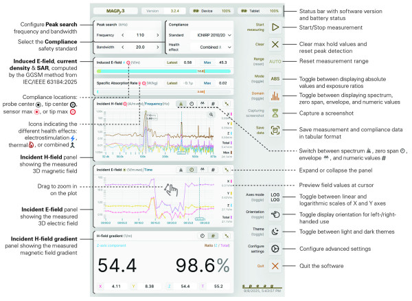 The MAGPy software (SW) V3.0+ is easy to use via its intuitive GUI installed on the tablet PC. The following is displayed in real-time: